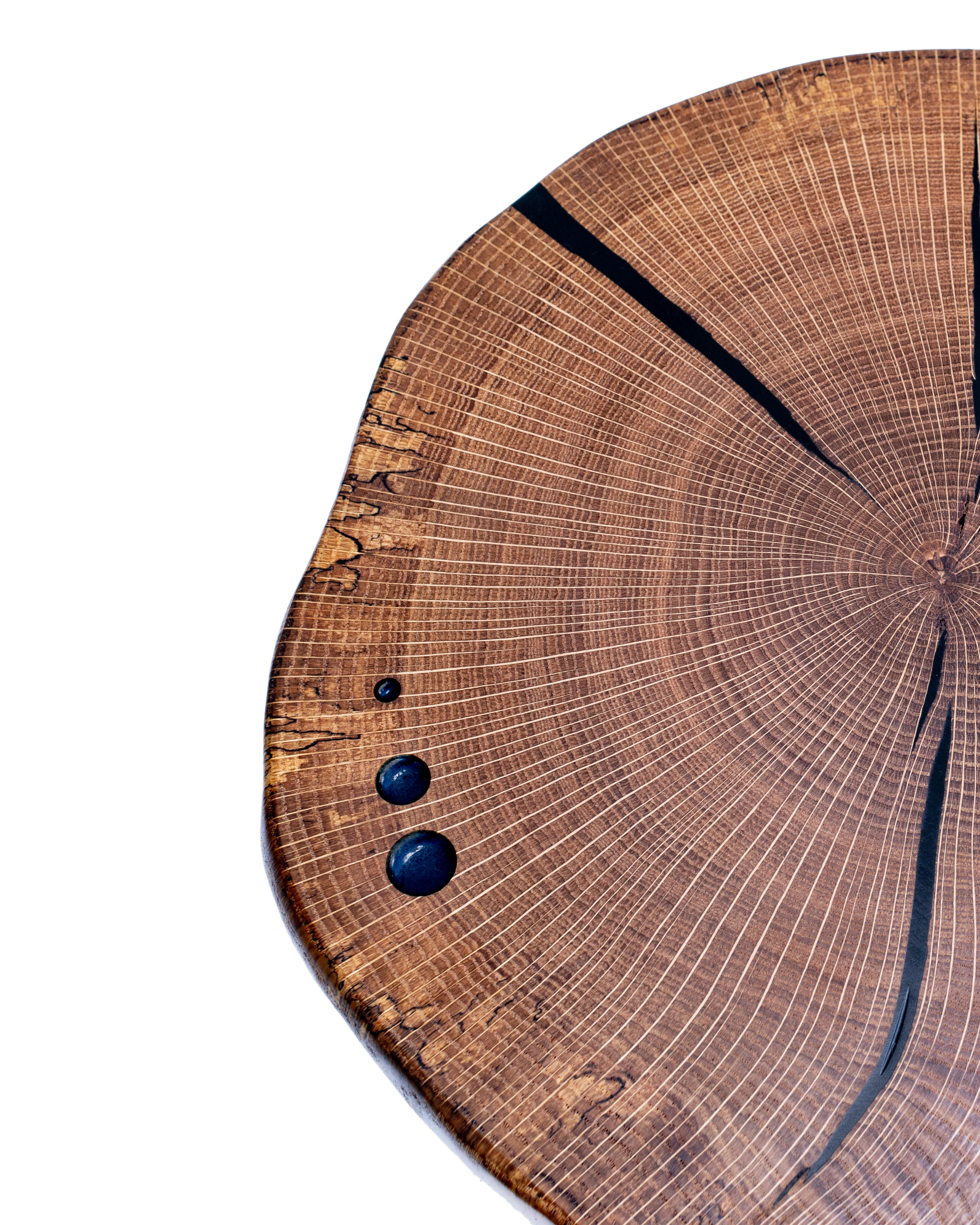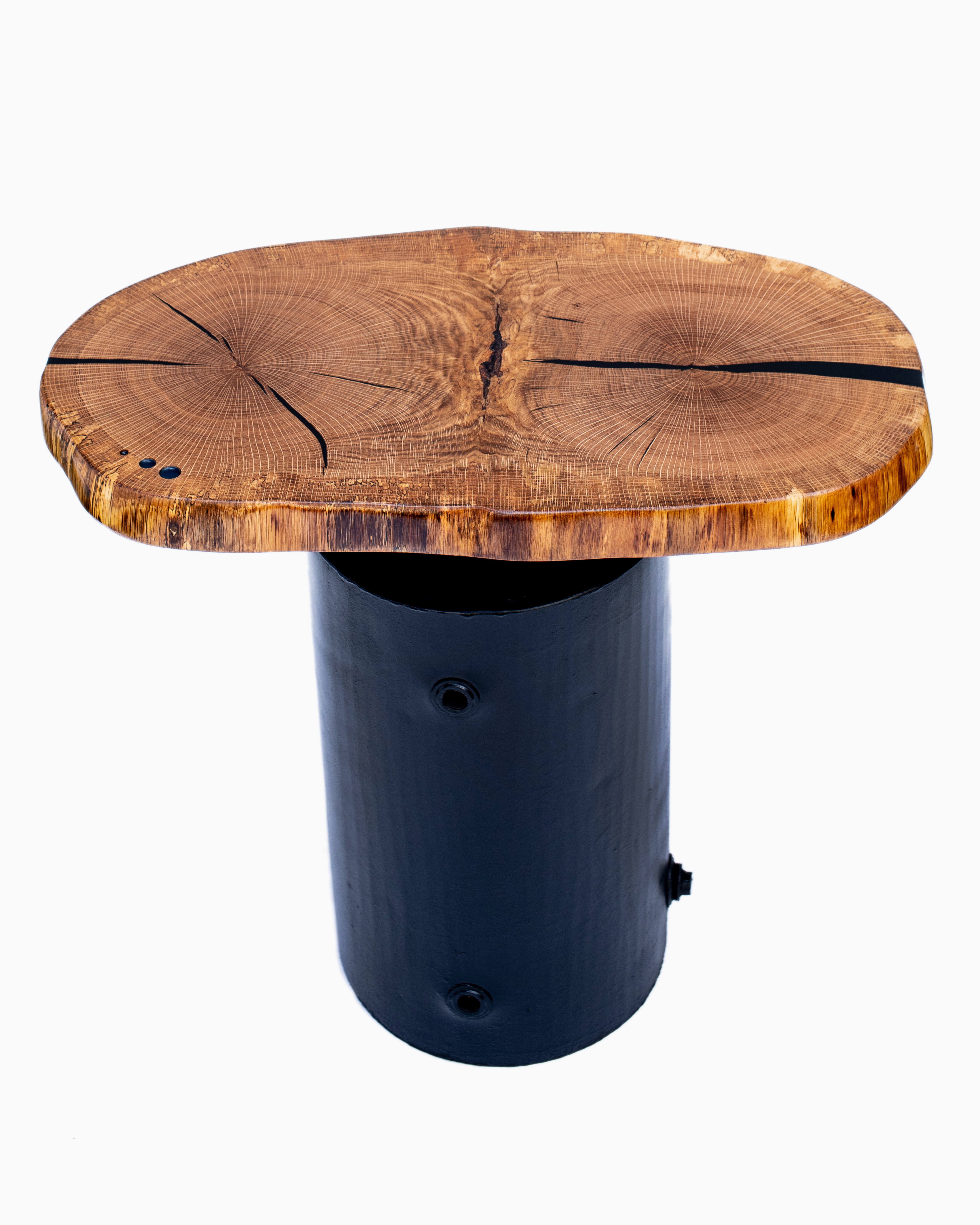 Air dried. Cross-cut slab is two oak trees grown together with black resin inlaid in cracks. Base circa 1930s. Steel hot water expansion tank used in home heating systems. Re-painted black with flange mount.