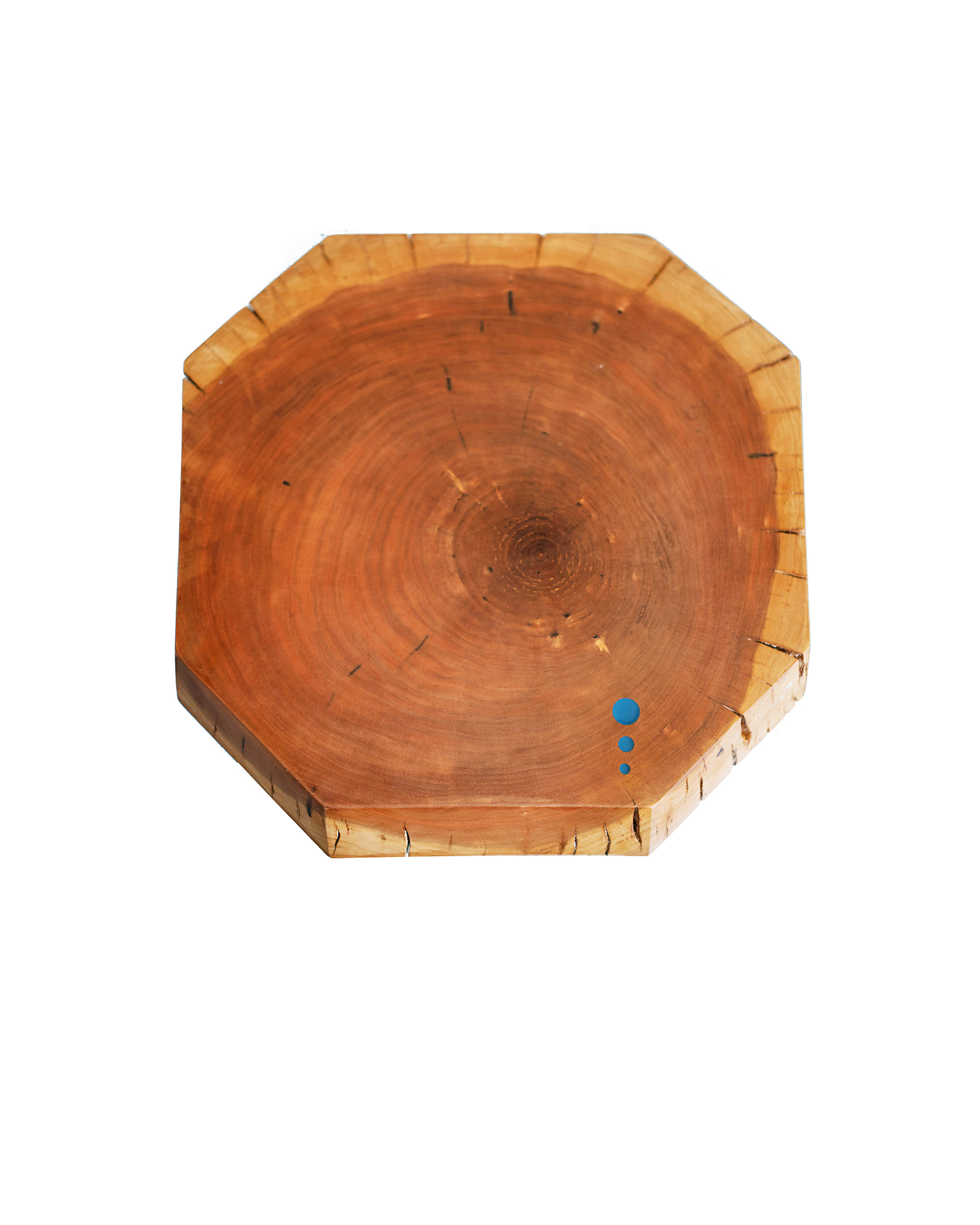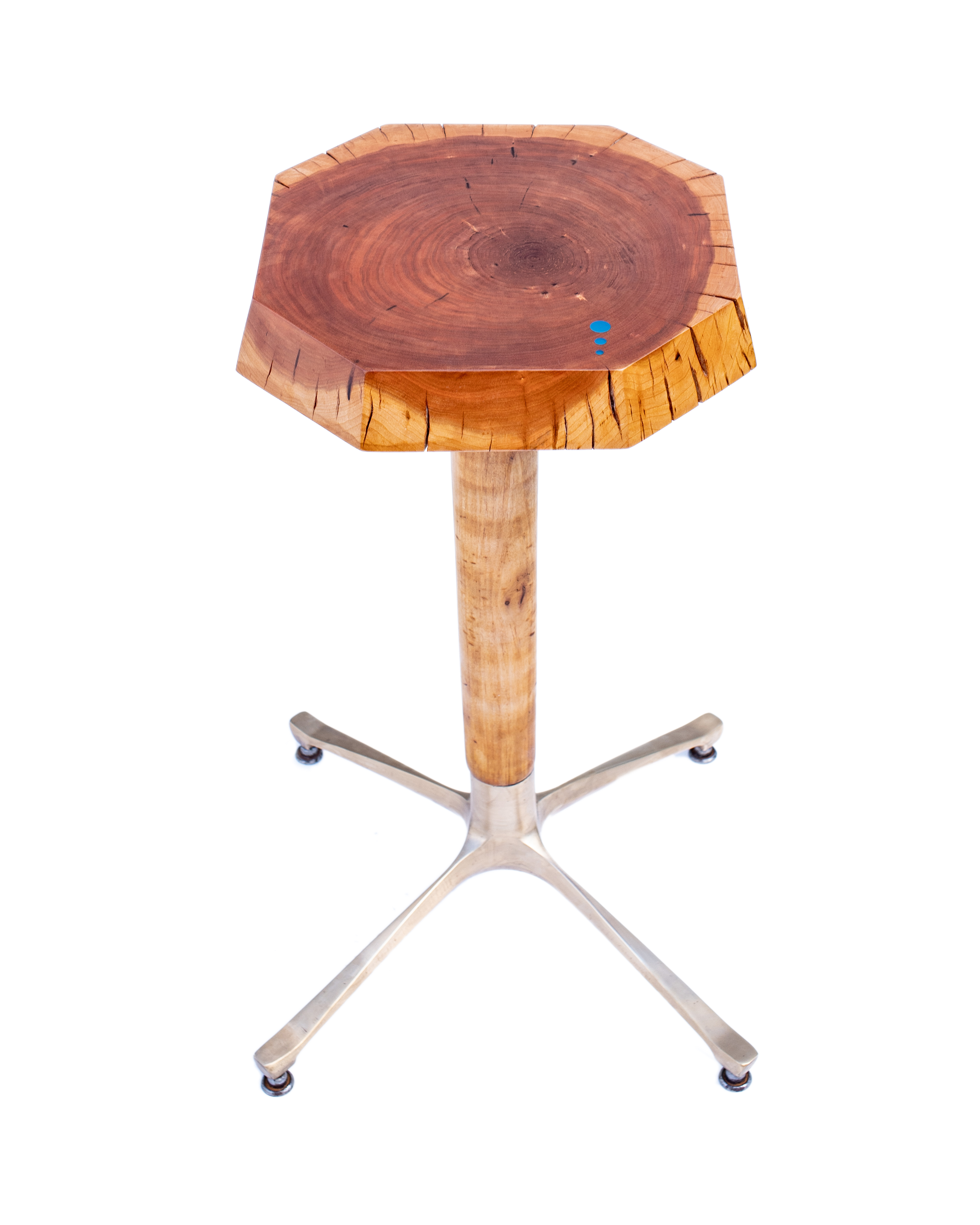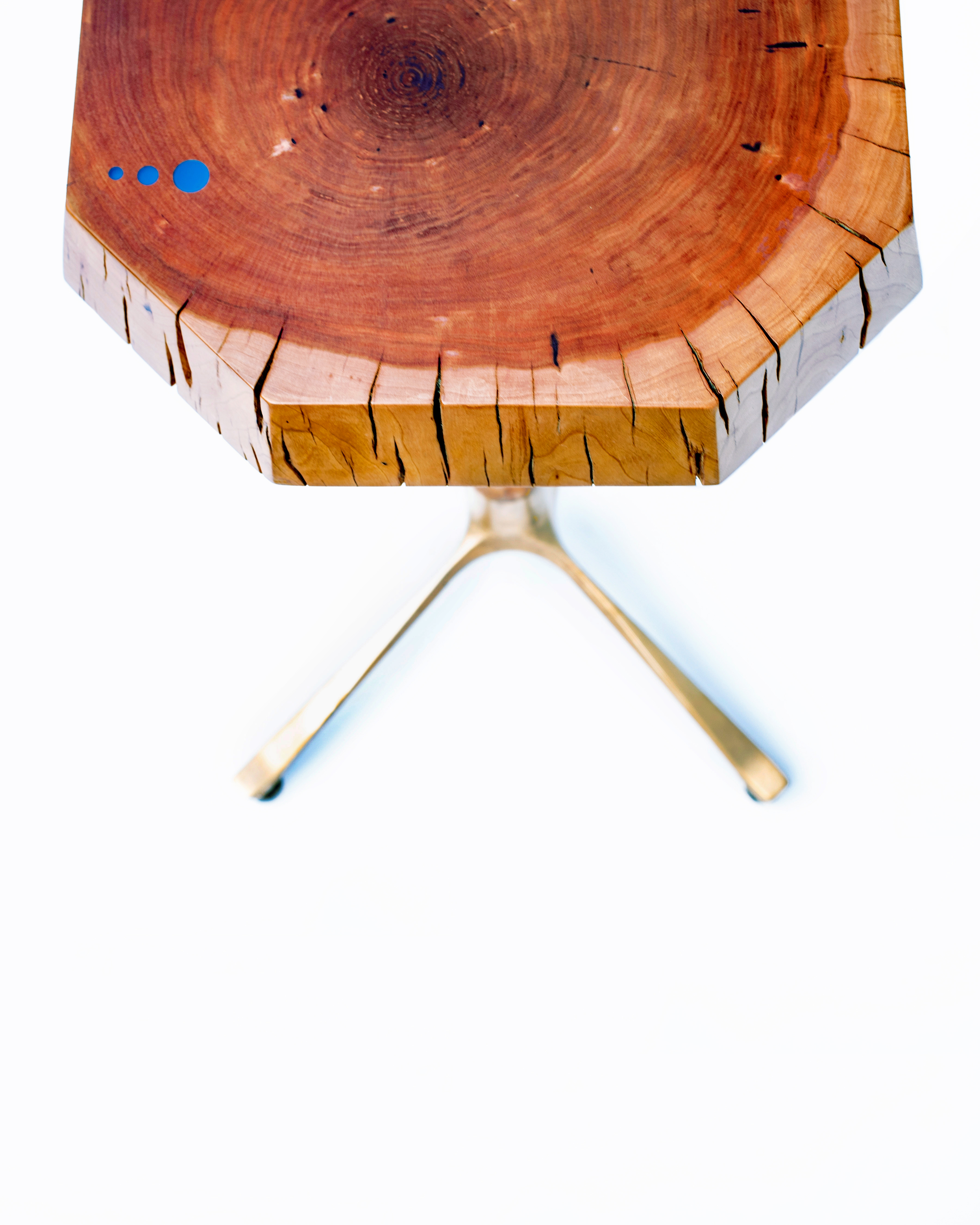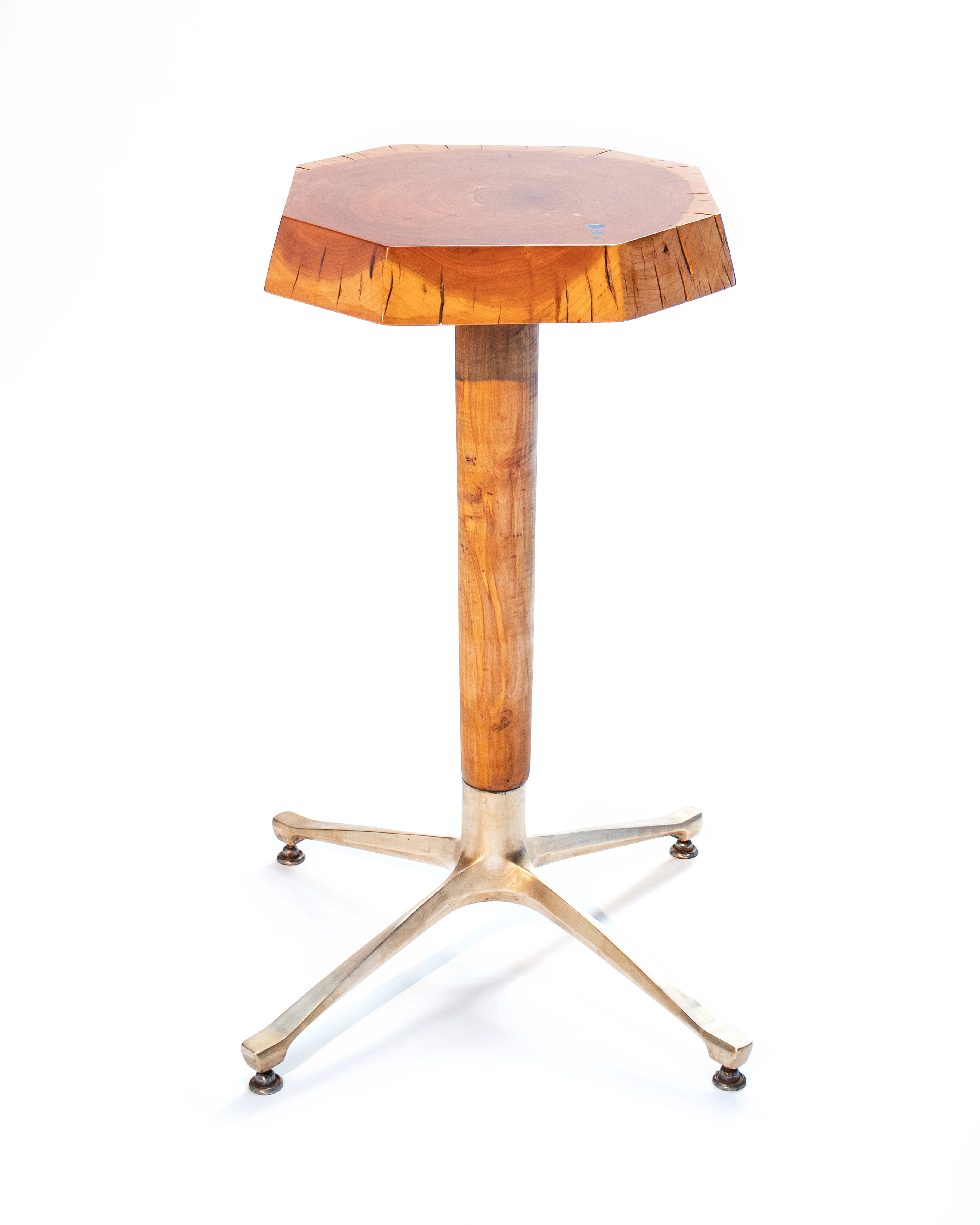 Air dried. Cross-cut slab milled free-hand after Hurricane Sandy. Base circa 1950’s with brass legs, original feet, wood column and steel 5-point table-top attachment. Entire base has been stripped and refinished by hand with natural oil.