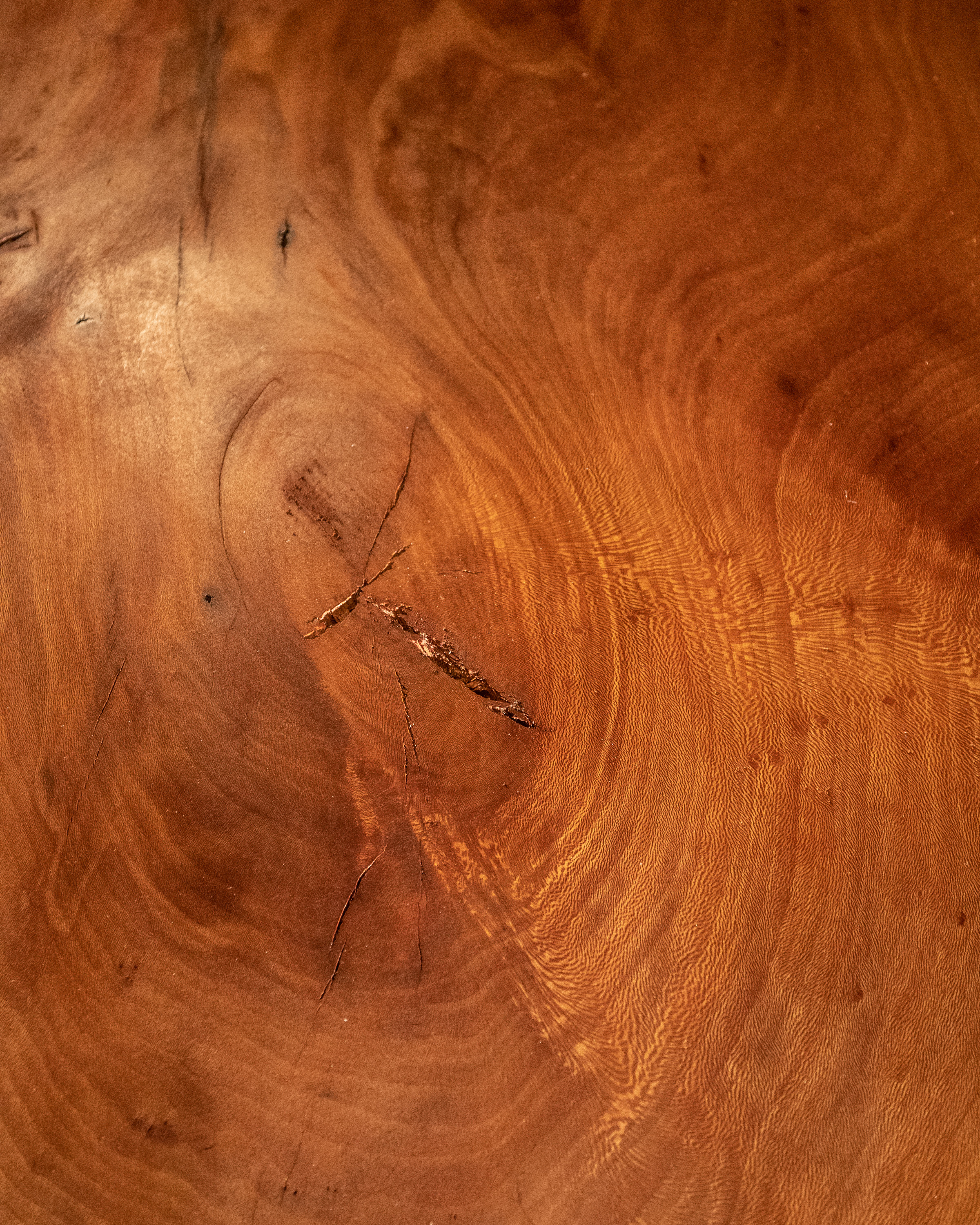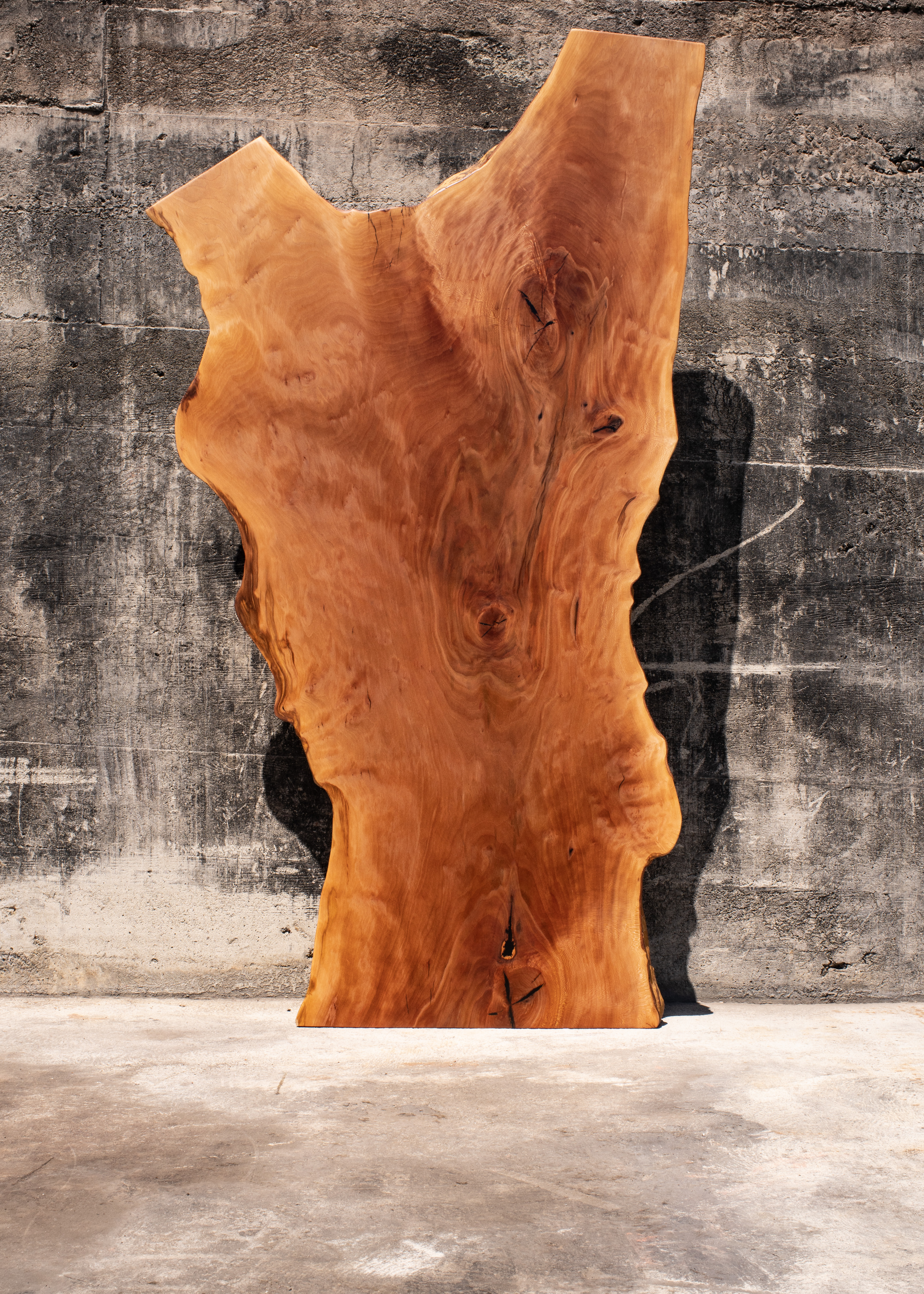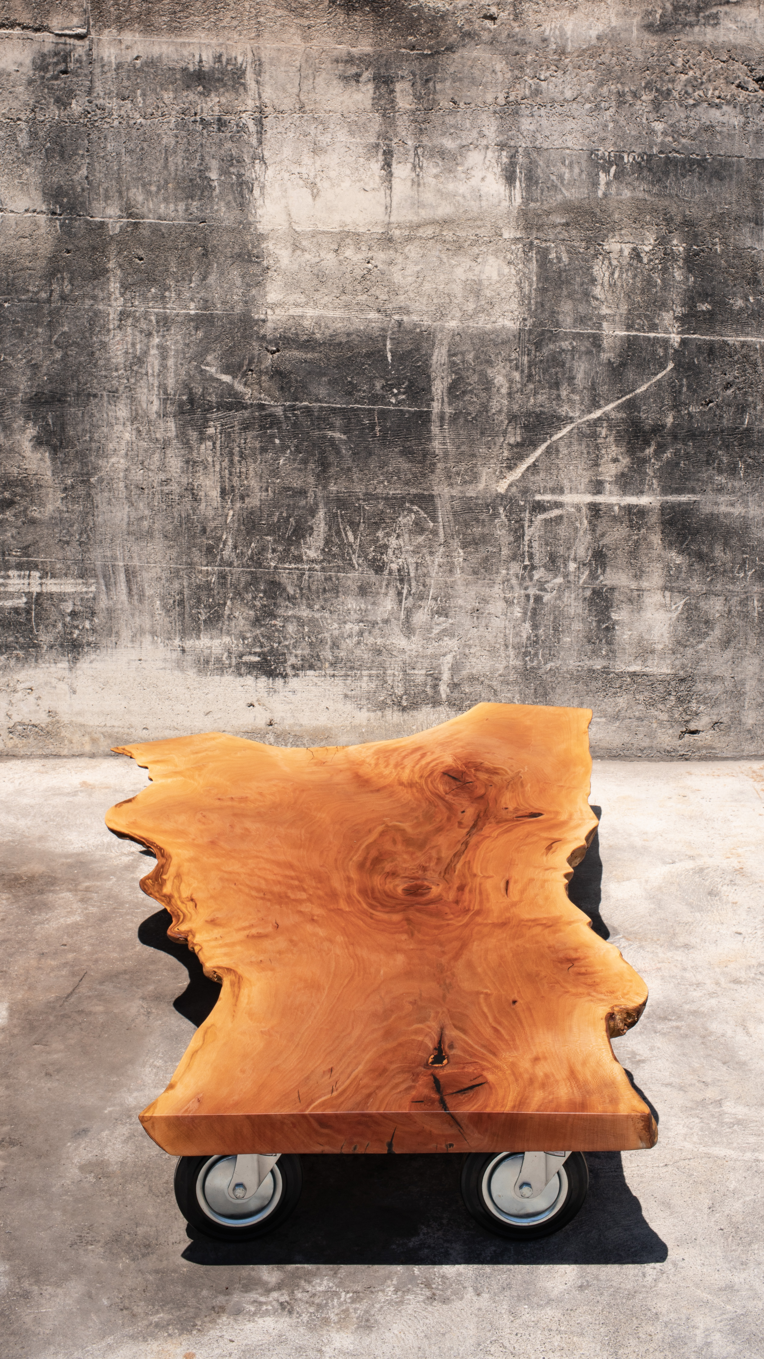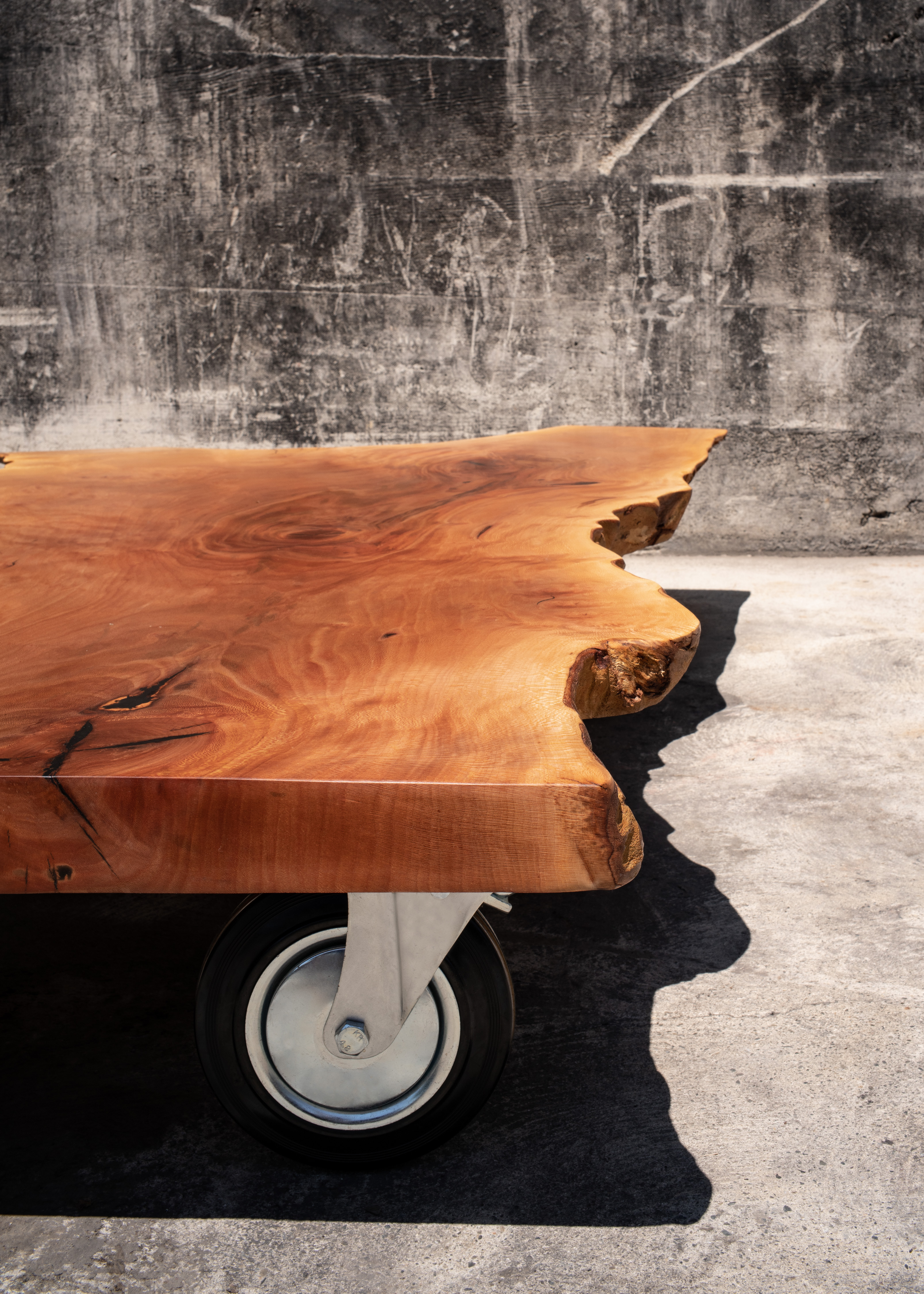 Air dried. Solid live edge slab with black resin inlay mounted on 10’’ locking caster wheels. *3 Additional slabs available. Vintage casters or custom legs available upon upon request. Table can be adapted for use as desk, dining table, or as standing sculpture